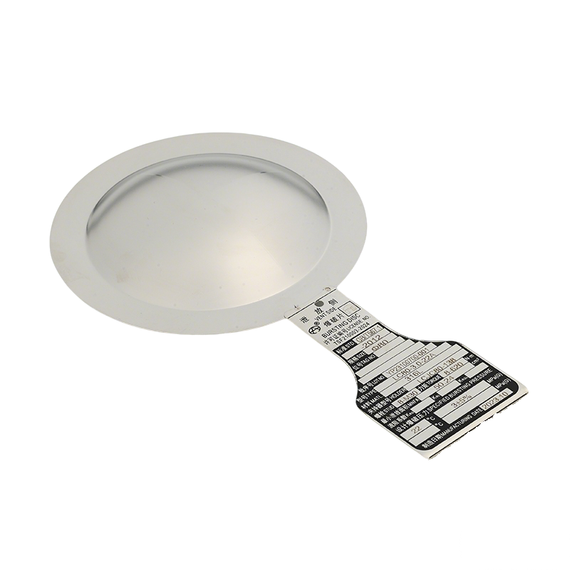 爆破片为单层膜片,凹面或凸面刻有削弱强度的十字槽或环形槽,超压时从刻槽处拉伸破坏。